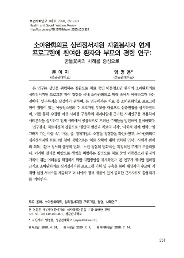 [연구] 소아완화의료 심리정서지원 자원봉사자 연계 프로그램에 참여한 환자와 부모의 경험 연구, 꿈틀꽃씨의 사례를 중심으로 꿈틀꽃씨 발간자료 0 9373 2021.02.02 11:12 2021.02.02 11:12 3. 소아완화의료 심리정서지원 자원봉사자 연계 프로그램에 참여한 환자와 부모의 경험 연구, 꿈틀꽃씨의 사례를 중심으로.pdf (652.9K) + 134 소아완화의료 심리정서지원 자원봉사자 연계 프로그램에 참여한 환자와 부모의 경험 연구:꿈틀꽃씨의 사례를 중심으로 문이지, 엄명용